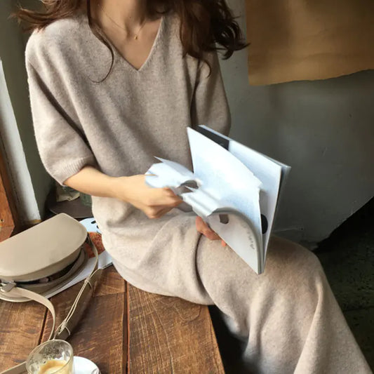 V-Neck Cashmere Knit Dress for Women, Autumn Winter